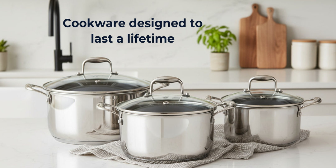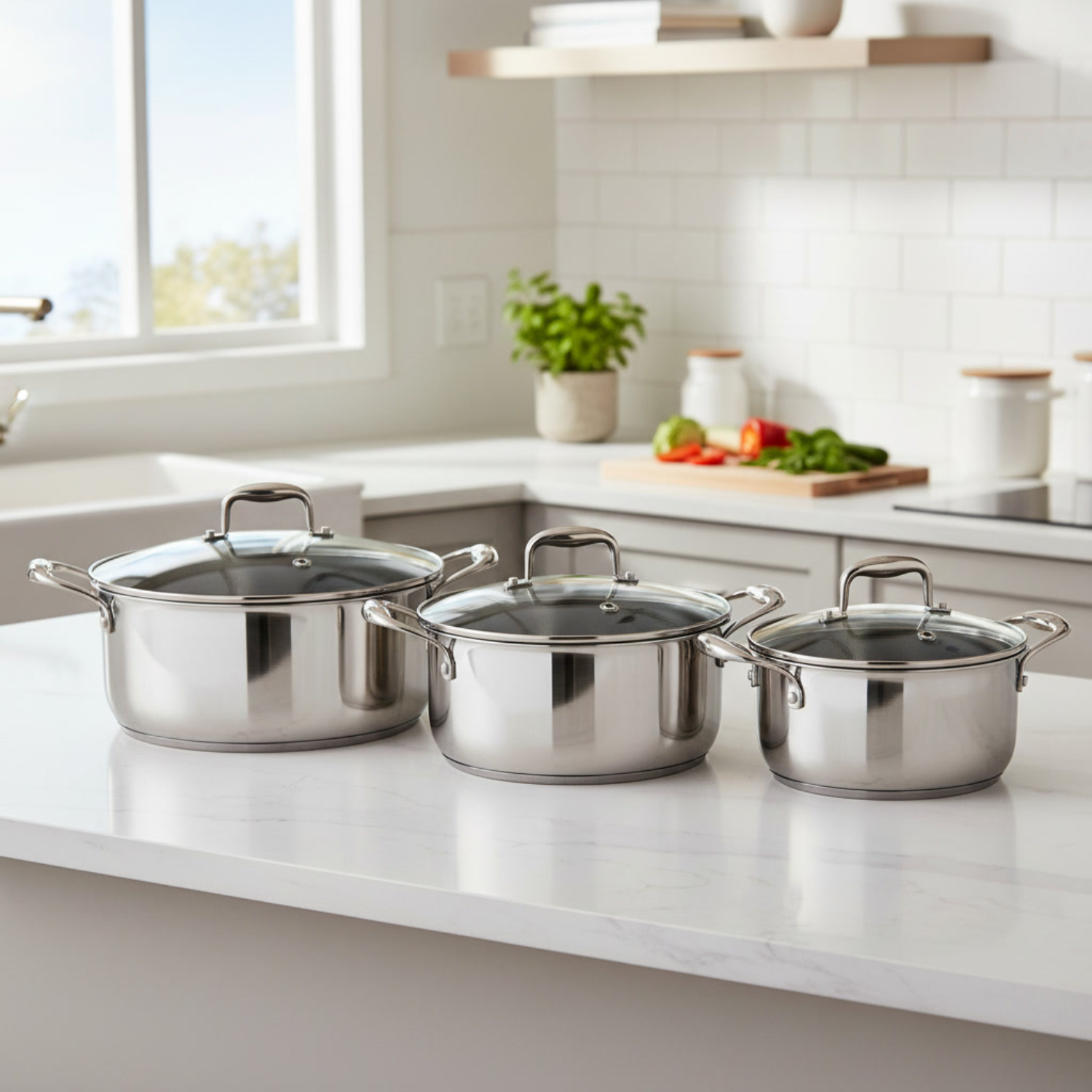 The VERTEX Pot Set is a premium, everyday-ready 6-piece cookware set built for real-life cooking: soups, stews, pasta, sauces, and batch meals. It includes three stainless-steel hybrid pots plus three safety glass lids, designed for steady temperature control, even cooking, and easy cleanup.